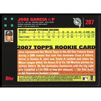 This is a 2007 Topps Red Backs Jose Garcia baseball card. The card is #287 and pictures show condition.