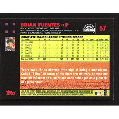 This is a 2007 Topps Red Backs Brian Fuentes baseball card. The card is #57 and pictures show condition.