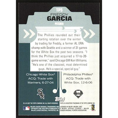 This is a 2007 Topps Trading Places Freddy Garcia baseball card. The card is #TP5 and pictures show condition. Team(s): Chicago White Sox/Philadelphia Phillies