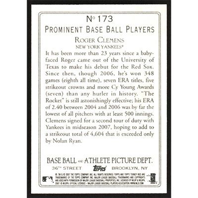 This is a 2007 Topps Turkey Red Roger Clemens baseball card. The card is #173 and pictures show condition.