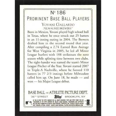 This is a 2007 Topps Turkey Red Yovani Gallardo baseball card. The card is #186 and pictures show condition. Team(s): Milwaukee Brewers Rookie Card (RC)