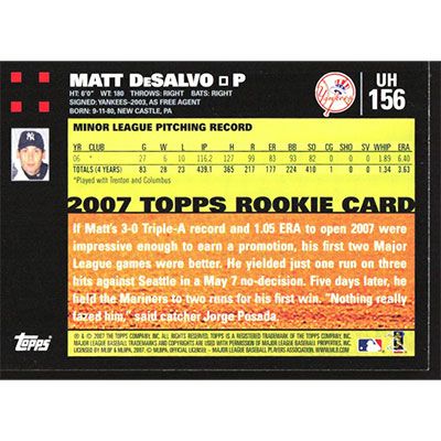 This is a 2007 Topps Update Matt DeSalvo baseball card. The card is #UH156 and pictures show condition.