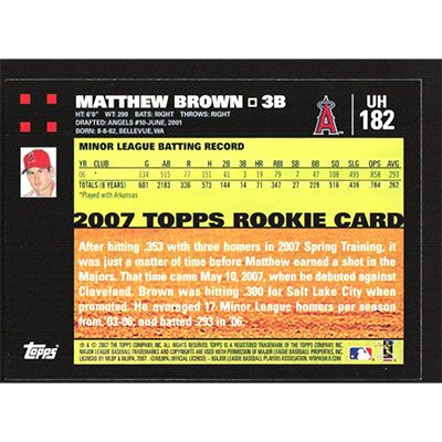 This is a 2007 Topps Update Matthew Brown baseball card. The card is #UH182 and pictures show condition. Team(s): Los Angeles Angels Rookie Card (RC)