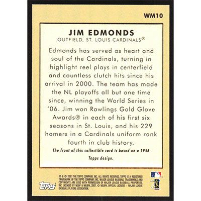 This is a 2007 Topps Wal-Mart Jim Edmonds baseball card. The card is #WM10 and pictures show condition.