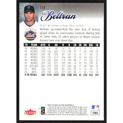 This is a 2007 Ultra Carlos Beltran baseball card. The card is #118 and pictures show condition.