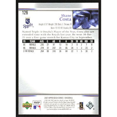 This is a 2007 Upper Deck Shane Costa baseball card. The card is #126 and pictures show condition.