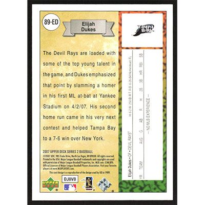 This is a 2007 Upper Deck 1989 Rookie Reprints Elijah Dukes baseball card. The card is #89-ED and pictures show condition. Team(s): Tampa Bay Devil Rays Rookie Card (RC)