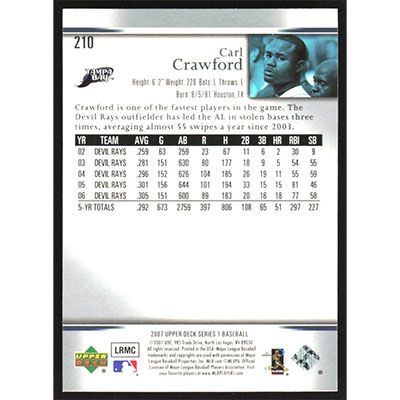 This is a 2007 Upper Deck Carl Crawford baseball card. The card is #210 and pictures show condition.