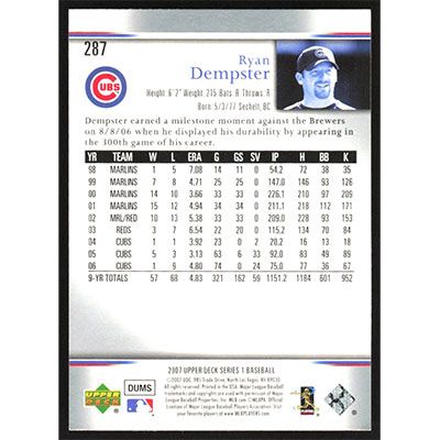 This is a 2007 Upper Deck Ryan Dempster baseball card. The card is #287 and pictures show condition.