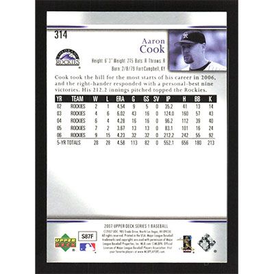 This is a 2007 Upper Deck Aaron Cook baseball card. The card is #314 and pictures show condition.