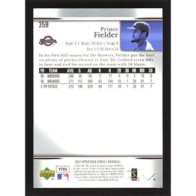 This is a 2007 Upper Deck Prince Fielder baseball card. The card is #359 and pictures show condition.