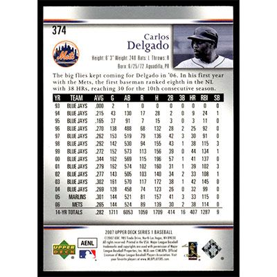 This is a 2007 Upper Deck Carlos Delgado baseball card. The card is #374 and pictures show condition.