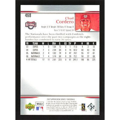 This is a 2007 Upper Deck Chad Cordero baseball card. The card is #468 and pictures show condition.