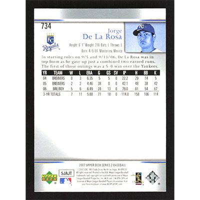 This is a 2007 Upper Deck Jorge De La Rosa baseball card. The card is #734 and pictures show condition.