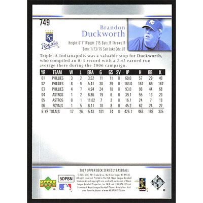 This is a 2007 Upper Deck Brandon Duckworth baseball card. The card is #749 and pictures show condition.