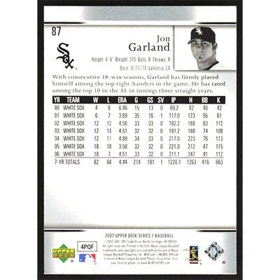 This is a 2007 Upper Deck Jon Garland baseball card. The card is #87 and pictures show condition.