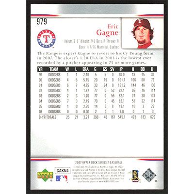 This is a 2007 Upper Deck Eric Gagne baseball card. The card is #979 and pictures show condition.