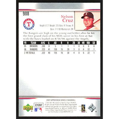 This is a 2007 Upper Deck Nelson Cruz baseball card. The card is #988 and pictures show condition.