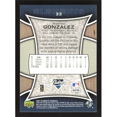 This is a 2007 Upper Deck Elements Adrian Gonzalez baseball card. The card is #33 and pictures show condition.