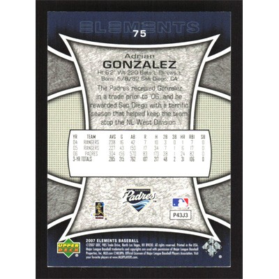 This is a 2007 Upper Deck Elements Adrian Gonzalez baseball card. The card is #75 and pictures show condition.
