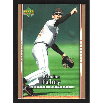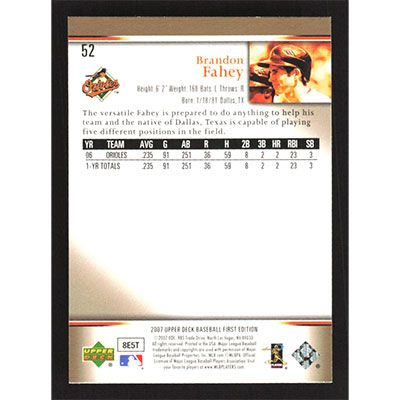 This is a 2007 Upper Deck First Edition Brandon Fahey baseball card. The card is #52 and pictures show condition.
