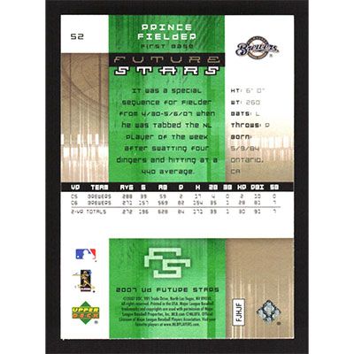 This is a 2007 Upper Deck Future Stars Prince Fielder baseball card. The card is #52 and pictures show condition.