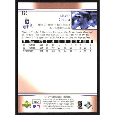 This is a 2007 Upper Deck Gold Shane Costa baseball card. The card is #126 and pictures show condition. This card is limited; #'d 05/75. Team(s): Kansas City Royals