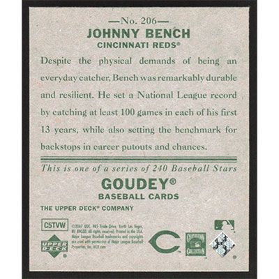 This is a 2007 Upper Deck Goudey Johnny Bench short print baseball card. The card is #206 and pictures show condition.