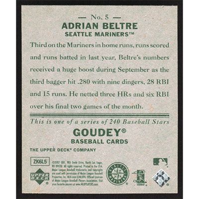 This is a 2007 Upper Deck Goudey Adrian Beltre baseball card. The card is #5 and pictures show condition.