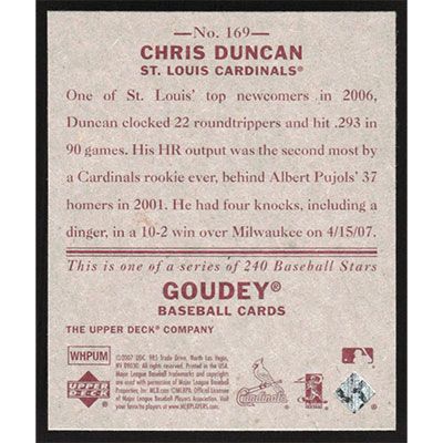 This is a 2007 Upper Deck Goudey Red Backs Chris Duncan baseball card. The card is #169 and pictures show condition.