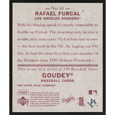 This is a 2007 Upper Deck Goudey Red Backs Rafael Furcal baseball card. The card is #85 and pictures show condition.