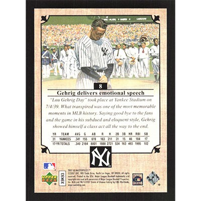 This is a 2007 Upper Deck Masterpieces Glossy Lou Gehrig baseball card. The card is #8 and pictures show condition.