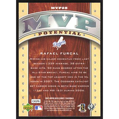 This is a 2007 Upper Deck MVP Potential Rafael Furcal baseball card. The card is #MVP28 and pictures show condition.