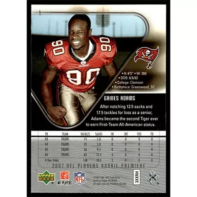 This is a 2007 Upper Deck Rookie Premiere Gaines Adams football card. The card is #1 and pictures show condition. Team: Tampa Bay Buccaneers Rookie Card