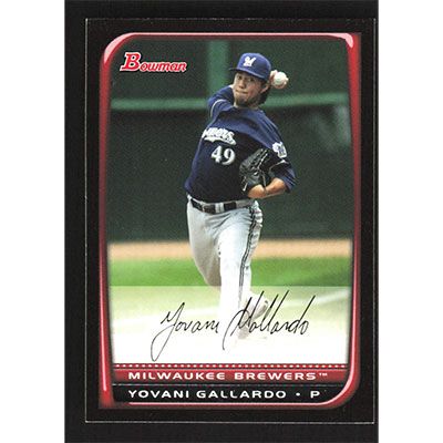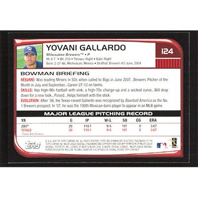 This is a 2008 Bowman Yovani Gallardo baseball card. The card is #124 and pictures show condition.