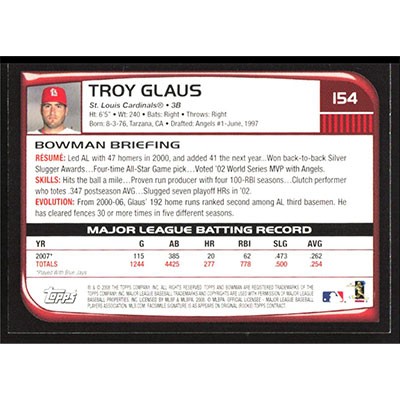 This is a 2008 Bowman Troy Glaus baseball card. The card is #154 and pictures show condition.