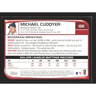 This is a 2008 Bowman Michael Cuddyer baseball card. The card is #188 and pictures show condition.