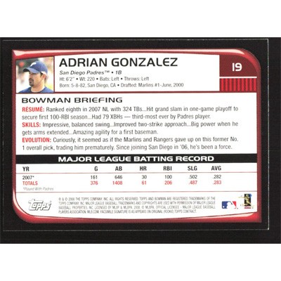 This is a 2008 Bowman Adrian Gonzalez baseball card. The card is #19 and pictures show condition.