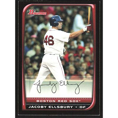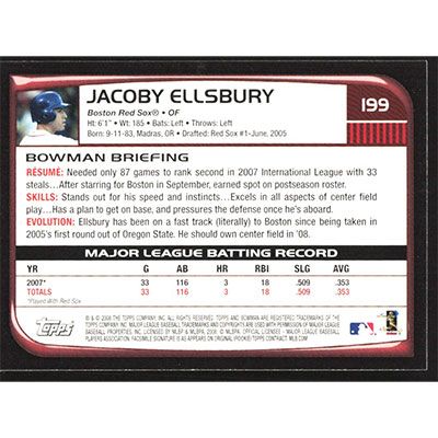 This is a 2008 Bowman Jacoby Ellsbury baseball card. The card is #199 and pictures show condition.