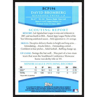 This is a 2008 Bowman Chrome Prospects David Bromberg baseball card. The card is #BCP194 and pictures show condition.