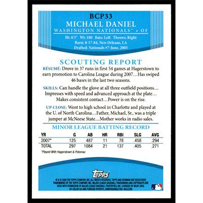 This is a 2008 Bowman Chrome Prospects Michael Daniel baseball card. The card is #BCP33 and pictures show condition.