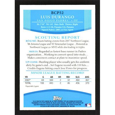 This is a 2008 Bowman Chrome Prospects Luis Durango baseball card. The card is #BCP52 and pictures show condition.