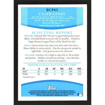 This is a 2008 Bowman Chrome Prospects Caleb Gindl baseball card. The card is #BCP85 and pictures show condition.