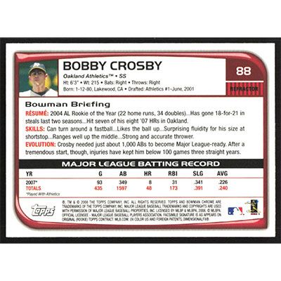 This is a 2008 Bowman Chrome Refractors Bobby Crosby baseball card. The card is #88 and pictures show condition.