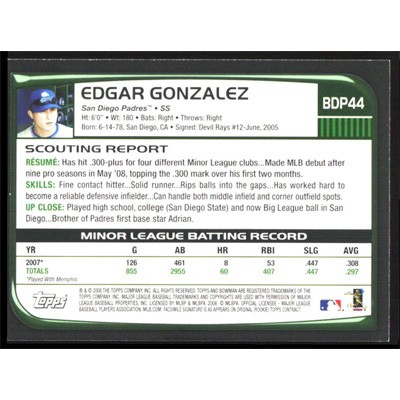 This is a 2008 Bowman Draft Edgar Gonzalez baseball card. The card is #BDP44 and pictures show condition. Team(s): San Diego Padres Rookie Card (RC)