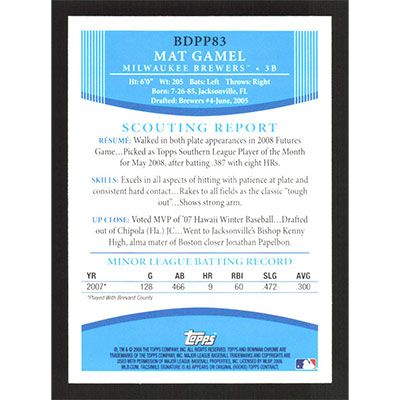 This is a 2008 Bowman Draft Prospects Mat Gamel baseball card. The card is #BDPP83 and pictures show condition.