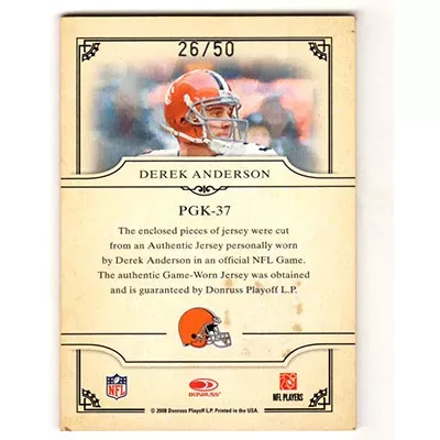 This is a 2008 Donruss Threads Pro Gridiron Kings Materials Prime Derek Anderson double jersey football card. The card is #PGK-37. See scan for condition. This card is limited; #'d 26/50.