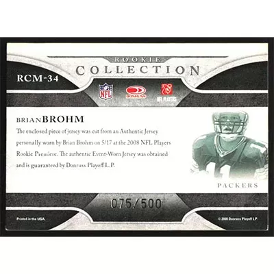 This is a 2008 Donruss Threads Rookie Collection Materials Brian Brohm Jersey football card. The card is #RCM-34 and pictures show condition. This card is limited; #'d 075/500.