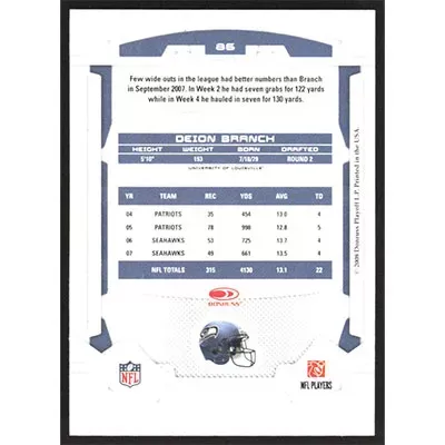 This is a 2008 Leaf Rookies & Stars Deion Branch football card. The card is #86 and pictures show condition.