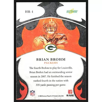 This is a 2008 Score Hot Rookies Brian Brohm football card. The card is #HR-1 and pictures show condition.